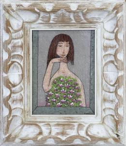 <span class='ref_item'>103 -</span> <span class="object_title">RETRATO DE MUJER SEMIDESNUDA</span>   <p><span class="author">ALBERTO DUCE (Zaragoza, 1915-2003)  </span> <br><span class="technique_material">Óleo sobre tabla</span><br><span class="technical_description">Representa el rostro de una mujer de pelo blanco mostrando su torso desnudo.<br/>Firmado por el autor en el ángulo inferior derecho.<br/>Enmarcado en madera tallada y envejecida.<br/>Medidas marco: 39,5x37cm</span><br></p>