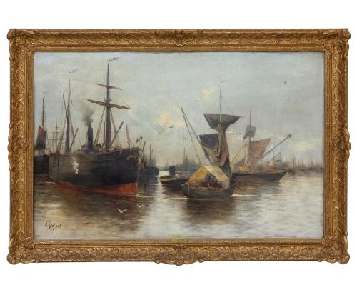 <span class='ref_item'>98 -</span> <span class="object_title">"MARINA"</span>   <p><span class="author">A. DEFORT</span> <br><span class="technique_material">Óleo sobre lienzo reentelado</span><br><span class="technical_description">Representando una serie de buques y chalupas pendientes de entrada en el puerto. Firmado A. DEFORT por el autor en el ángulo inferior izquierdo. Pintor nacido en el S.XIX y fallecido en el S.XX .<br/>Enmarcado en madera tallada y dorada. Con placa metálica de autor en el marco. Medidas marco: 74cm x 121cm</span><br></p>