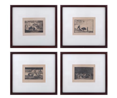 <span class='ref_item'>106 -</span> <span class="object_title">"LA TAUROMAQUIA" CÍRCULO DE BELLAS ARTES, MADRID (1929)</span>   <p><span class="author">FRANCISCO DE GOYA Y LUCIENTES (Fuendetodos, 1746-Burdeos, 1828)</span> <br><span class="technique_material">Aguafuerte</span><br><span class="technical_description">Conjunto de 4 grabados en aguafuerte que reproducen la serie "La Tauromaquia" realizada por Goya en 1816. Cada uno contiene el sello en seco con la efigie de Goya e inscripción "La Tauromaquia" en el ángulo inferior derecho, además de la enumeración del 29 al 32 en ángulo superior derecho.<br/>Edición realizada a partir de las planchas originales por la Calcográfica Nacional con motivo del centenario de la muerte del pintor y publicada por el Círculo de Bellas Artes en 1929.<br/>Enmarcados en madera y cristal con paspartú.<br/>Medidas huella: 12x16cm<br/>Medidas marco: 30x33,5cm</span><br></p>