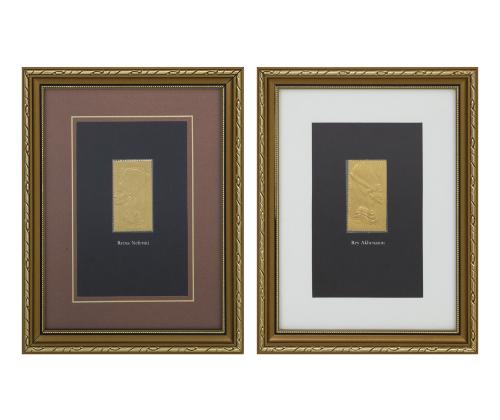 <span class='ref_item'>107 -</span> <span class="object_title">PAREJA DE ESTAMPACIONES EN FINA LÁMINA DE ORO CON LOS BUSTOS DE NEFERTITI Y AKHENATON.</span>   <p><span class="technical_description">Ambos enmarcados en madera tallada dorada y paspartú con cristal. <br/>Medidas: 22,5x18cm</span><br></p>