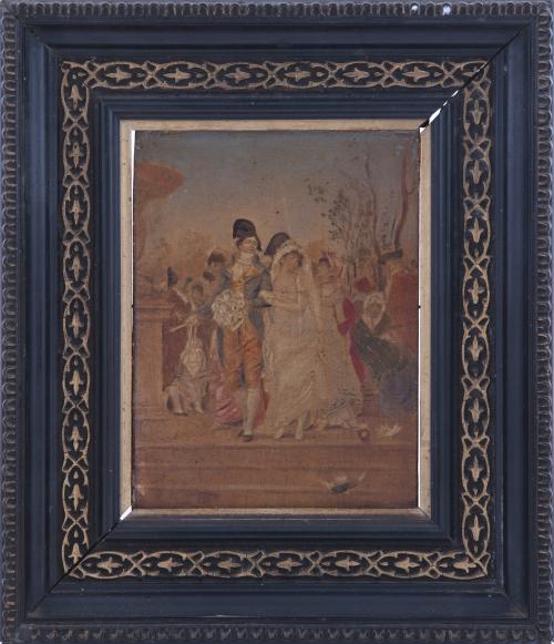 <span class='ref_item'>112 -</span> <span class="object_title">"SALIDA DE UNA BODA"</span>   <p><span class="author">ESCUELA ESPAÑOLA S. XIX  </span> <br><span class="technique_material">Heliografía sobre tabla</span><br><span class="technical_description">Escena del original que se encuentra en el Museo del Prado.<br/>Enmarcado en madera negra con embellecedor metálico. Medidas marco: 22cm x 19cm. Medidas tabla: 14cm x 10cm</span><br></p>