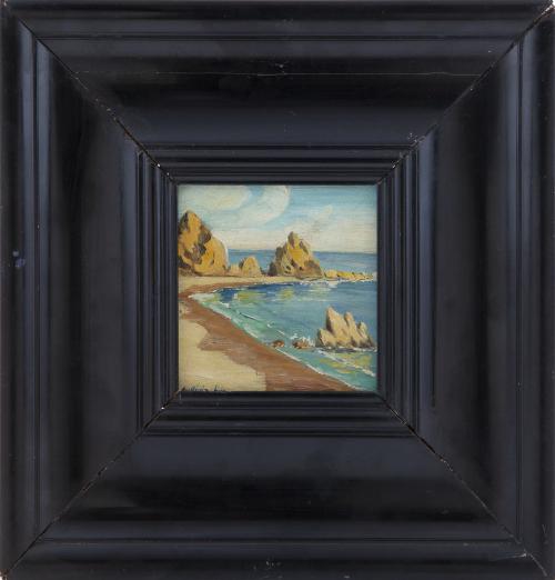 <span class='ref_item'>111 -</span> <span class="object_title">MARINA REPRESENTANDO UNA PLAYA DEL CANTÁBRICO. FIRMADO APELLANIZ IBARRA. 1946</span>   <p><span class="technique_material">Óleo sobre tabla</span><br><span class="technical_description">Marina representando una playa del Cantábrico. Firmado Apellaniz Ibarra (hijo). En marco de madera negra lacada. Titulado y fechado en el reverso.<br/>Medidas: 23 x 23 cm (Marco incluido)</span><br></p>