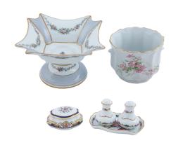 <span class='ref_item'>175 -</span> <span class="object_title">CONJUNTO DE SEIS PIEZAS EN PORCELANA DE LIMOGES (FRANCIA, S. XX)</span>   <p><span class="technical_description">Lote compuesto por centro de mesa, jarrón, salero y pimentero con cajita. Cada pieza con sello en la base, y decoradas con motivos florales.</span><br></p>