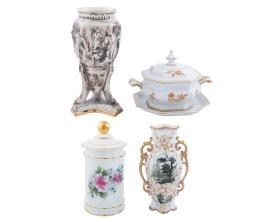 <span class='ref_item'>186 -</span> <span class="object_title">LOTE DE CUATRO PIEZAS EN PORCELANA EUROPEA</span>   <p><span class="technical_description">Un jarrón con sello portugués Pereira, Un jarrón pintado a mano con sello alemán de Bavaria, un jarrón con tapa con sello español y una sopera con sobre plato de porcelana francesa sello Limoges.<br/> </span><br></p>
