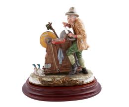 <span class='ref_item'>170 -</span> <span class="object_title">FIGURA EN PORCELANA CAPODIMONTE REPRESENTANDO UN AFILADOR DE CUCHILLOS</span>   <p><span class="technical_description">Figura realizada porcelana policromada de Capidomonte con sello en el reverso y firma B. Merli. Sobre base de madera redonda. Con desperfecto en la base de la figura y uno de los patos le falta el pico.<br/>Medidas: 38x35cm</span><br></p>