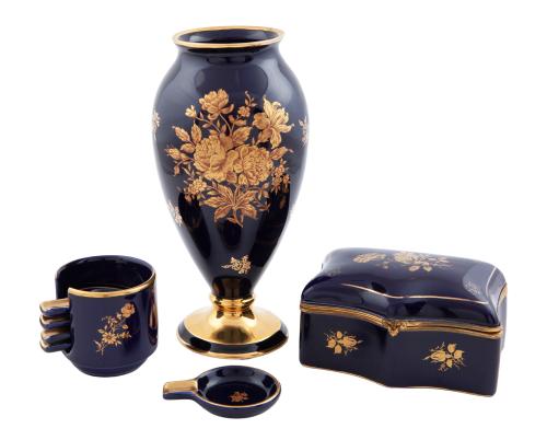 <span class='ref_item'>173 -</span> <span class="object_title">LOTE DE TRES PIEZAS EN PORCELANA POLICROMADA Y DORADA DE LIMOGES (FRANCIA, S.XX)</span>   <p><span class="technical_description">Formado por un jarrón, unos ceniceros y una pitillera, en porcelana azul con motivos florales dorados con sello en el reverso.<br/>La caja presenta desperfecto en el cierre. (tapa despegada del contorno metálico).</span><br></p>