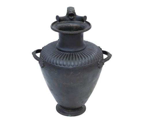<span class='ref_item'>169 -</span> <span class="object_title">ÁNFORA FRANCESA EN BRONCE DATADA EN 1850, PERIODO DE NAPOLEÓN III</span>   <p><span class="technical_description">Ánfora fundida en bronce cincelado, con asas rematadas en figuras femeninas y cabeza de león, en la parte superior. Sigue la forma de una pieza griega arcaica pero fue realizada en la época de Napoleón III. Se acompaña de certificado de expertización.<br/>Medidas: 47.5cm de alta por 19.2cm de diámetro en la zona del cuello abierto.</span><br></p>