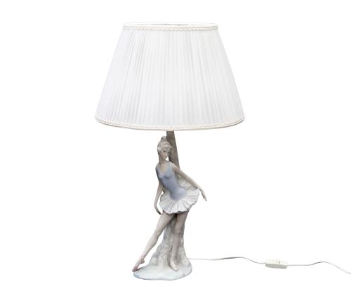<span class='ref_item'>174 -</span> <span class="object_title">LAMPARA DE SOBREMESA</span>   <p><span class="technical_description">Lámpara de sobremesa representando a una bailarina con tutú apoyada en el tronco de un árbol que a su vez sirve como pie de lámpara. Con pantalla blanca y cableado de encendido. Lámpara en funcionamiento. Firmada NAO en la base. Medida: 63cm altura</span><br></p>