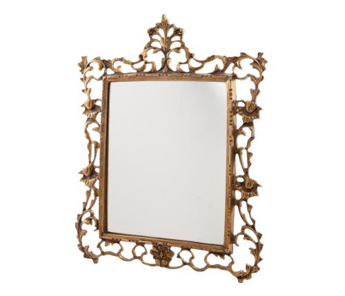 <span class='ref_item'>180 -</span> <span class="object_title">ESPEJO EN BRONCE CON DECORACIÓN CALADA  PARA COLGAR O APOYAR SOBRE MESA</span>   <p><span class="technical_description">Espejo realizado en bronce dorado con bisel rectangular y decoración calada con motivos barrocos : vegetales, tornapuntas y rocalla. Lleva soporte en bronce, en la parte posterior para apoyar sobre mesa<br/>Medidas: 44 x 34 cm<br/>Peso: 2.436,80 gr</span><br></p>