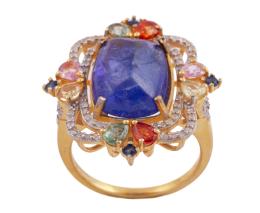 <span class='ref_item'>199 -</span> <span class="object_title">SORTIJA EN PLATA DE LEY CON TANZANITA, ZAFIROS MULTICOLOR Y DIAMANTES</span>  <p><span class="technical_description">Sortija realizada en plata de ley. Formada por una tanzanita central en talla cabujón fantasía (8ct), zafiros multicolor (1.5ct) y diamantes (0.4ct).<br/>Medida sortija: 15<br/>Ref: 16578<br/> </span><br>Peso: <span class="PESO_HCES1">7</span> <span class="PESOUMED_HCES1">gr.</span><br></p>