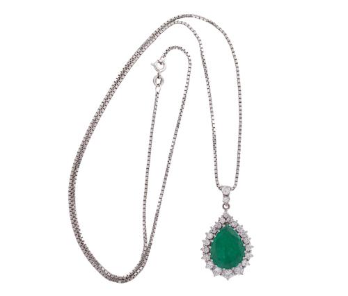 <span class='ref_item'>201 -</span> <span class="object_title">COLGANTE CON CADENA EN ORO DE 14 KT, GRAN ESMERALDA Y DIAMANTES</span>  <p><span class="technical_description">Colgante con cadena realizados en oro de 14 kt. El colgante con gran esmeralda central en talla perilla y peso aprox( 8ct) , adornada en orla y asa por diamantes en talla brillante con peso total aprox(1.25ct),<br/>Cadena veneciana con cierre de reasa<br/>Longitud: 60 cm</span><br>Peso: <span class="PESO_HCES1">16</span> <span class="PESOUMED_HCES1">gr.</span><br></p>