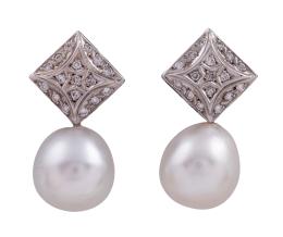 <span class='ref_item'>60 -</span> <span class="object_title">PENDIENTES EN ORO DE 18 KT.CON GRANDES PERLAS CULTIVADAS AUSTRALIANAS Y DIAMANTES</span>  <p><span class="technical_description">Pareja de pendientes realizados en oro de 18 kt. De dos cuerpos el superior adornado por diamantes en talla brillante con peso total aprox ( 0.50 ct) y colgando grandes perlas Australianas cultivadas calibradas aprox ( 14 mm )<br/>Cierre: Presión <br/>Ref: 75E565</span><br>Peso: <span class="PESO_HCES1">14</span> <span class="PESOUMED_HCES1">gr.</span><br></p>