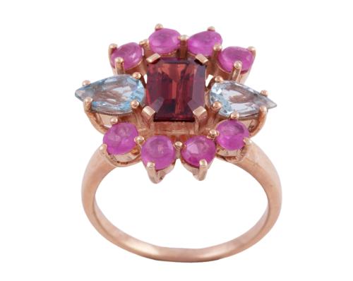 <span class='ref_item'>47 -</span> <span class="object_title">SORTIJA EN PLATA DE LEY BAÑADA EN ORO, GRANATE, RUBÍES Y AGUAMARINA</span>  <p><span class="technical_description">Sortija realizada en plata de ley bañada en oro. Diseño de flor con granate central en talla oval y en orla, como pétalos, rubíes en talla redonda y aguamarinas en talla pera<br/>Medida Sortija: 8<br/>Ref 15139</span><br>Peso: <span class="PESO_HCES1">4,10</span> <span class="PESOUMED_HCES1">gr.</span><br></p>