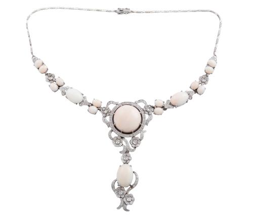 <span class='ref_item'>63 -</span> <span class="object_title">GARCANTILLA EN ORO DE 18 KT. CORAL PIEL DE ANGEL Y DIAMANTES</span>  <p><span class="technical_description">Gargantilla de precioso diseño floral, adornada por coral piel de ángel en tallas cabujón y detalles de flores y tornapuntas cuajados de diamantes en talla brillante con peso total aprox(3.25 ct).<br/>Cadena posterior con cierre de caja con lengüeta y doble ocho de seguridad.<br/>Longitud:45 cm<br/>Ref:75N20</span><br>Peso: <span class="PESO_HCES1">55,6</span> <span class="PESOUMED_HCES1">gr.</span><br></p>