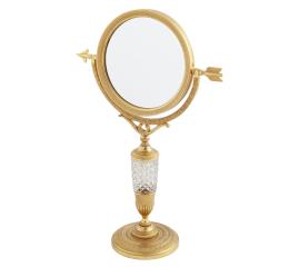<span class='ref_item'>185 -</span> <span class="object_title">ESPEJO DE TOCADOR O SOBREMESA. ESTILO IMPERIO, FF. S.XVIII</span>  <p><span class="technical_description">Espejo chapado en oro y con cristal de roca tallado en cuerpo. Decoración en relieve de motivos florales y geométricos. Dos caras de distintos aumentos con movimiento de 360º a través de la flecha que permite mover y asegurar el movimiento.<br/>Medidas: 34 x 22cm</span><br>Peso: <span class="PESO_HCES1">1054</span> <span class="PESOUMED_HCES1">gr.</span><br></p>