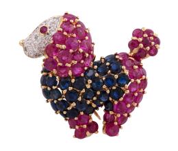 <span class='ref_item'>182 -</span> <span class="object_title">BROCHE EN ORO 18KT, RUBÍES, ZAFIROS Y DIAMANTES</span>  <p><span class="technical_description">Broche realizado en oro de 18kt. Con forma de animal, adornado por rubíes en talla redonda con peso total aprox 0.90ct, zafiros en talla redonda con peso total aprox 0.75ct y en la cabeza cuajado de diamantes en talla brillante con peso total aprox 0.15ct<br/>Cierre: Doble aguja con mecanismo de seguridad<br/>Medidas: 3 x 2,5cm<br/>RefC 11333</span><br>Peso: <span class="PESO_HCES1">10</span> <span class="PESOUMED_HCES1">gr.</span><br></p>