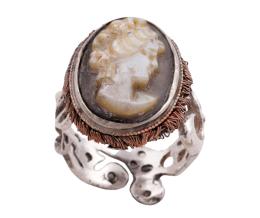 <span class='ref_item'>179 -</span> <span class="object_title">SORTIJA ANTIGUA EN PLATA DE LEY 925 MM Y CAMAFEO</span>  <p><span class="technical_description">Sortija antigua realizada en plata de ley 925 mm con aro calado y centro adornado por camafeo con perfil de dama en resina antigua.<br/>Medida sortija: 12</span><br>Peso: <span class="PESO_HCES1">6</span> <span class="PESOUMED_HCES1">gr.</span><br></p>