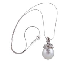<span class='ref_item'>176 -</span> <span class="object_title">COLGANTE Y CADENA EN ORO DE 18 KT CON GRAN PERLA AUSTRALIANA 15 MM Y DIAMANTES</span>  <p><span class="technical_description">Colgante y cadena realizados en oro de 18 kt. El colgante con gran perla Australiana calibrada aprox ( 15 mm) y adorno sinuoso en forma de serpiente adornado con diamantes en talla brillante con peso total aprox ( 0.50 ct). <br/>Cadena de eslabón " rabo de ratón" y cierre de reasa.<br/>Longitud: 40 cm</span><br>Peso: <span class="PESO_HCES1">14,50</span> <span class="PESOUMED_HCES1">gr.</span><br></p>