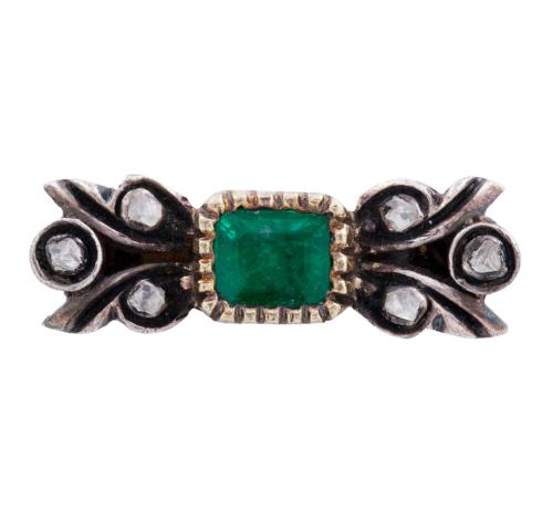 <span class='ref_item'>180 -</span> <span class="object_title">APLIQUE O ADORNO PARA COLLAR EN ORO DE 18 KT, PLATA DE LEY 925, ESMERALDA Y DIAMANTES</span>  <p><span class="technical_description">Aplique o adorno para collar realizado en oro de 18 kt con esmeralda central con peso aprox (0.40 ct) y diamantes en talla rosa sobre vistas en plata de ley 925, con peso total aprox(0.06ct)<br/>Medidas: 2cm x 0,50cm</span><br>Peso: <span class="PESO_HCES1">4</span> <span class="PESOUMED_HCES1">gr.</span><br></p>