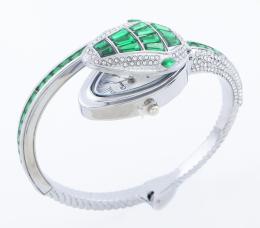 <span class='ref_item'>23 -</span> <span class="object_title">RELOJ DE PULSERA EN METAL PLATEADO, CRISTALES VERDES E INCOLOROS. CUARZO</span>  <p><span class="technical_description">Reloj de pulsera en metal plateado de la marca Cussi, con movimiento de cuarzo. Con forma de serpiente cuajada por cristales verdes en tallas marquise, baguette y trapecio, y cristales incoloros en talla brillante. Debajo de la cabeza de la serpiente se encuentra la esfera del reloj. Brazalete abierto semirrígido. En estado de marcha.<br/>Diámetro: 7cm</span><br>Peso: <span class="PESO_HCES1">46,30</span> <span class="PESOUMED_HCES1">gr.</span><br></p>