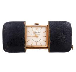 <span class='ref_item'>36 -</span> <span class="object_title">RELOJ VINTAGE DE VIAJE, SHIELDS FIFTH AVENUE CHAPADO EN ORO. CUERDA MANUAL</span>  <p><span class="technical_description">Reloj vintage de viaje hecho en Alemania, marca SHIELDS FIFTH AVENUE. Caja cuadrada en metal chapado en oro, esfera plateada con numeración a trazos aplicados dorados, al igual que las agujas y arábiga a las 12. Estuche de piel negra. Movimiento mecánico manual. En estado de marcha. <br/>Medidas: 3,5 x 5,5 cm.</span><br>Peso: <span class="PESO_HCES1">47,4</span> <span class="PESOUMED_HCES1">gr.</span><br></p>