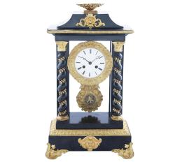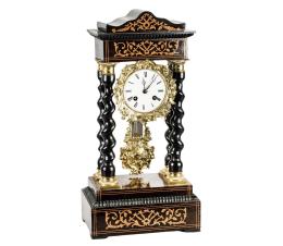 <span class='ref_item'>123 -</span> <span class="description">RELOJ DE PÓRTICO DE HORAS Y MEDIAS, ESTILO NAPOLEÓN III. FRANCIA, FF.S.XIX </span>  <p><span class="description">Reloj pórtico realizado en madera ebonizada y bronce dorado. Estructura formada por dos columnas salomónicas, frontón y base con elementos decorativos. La esfera, con números romanos en dorado es acompañada del péndulo regulador ricamente decorado. La maquinaria necesita limpieza. Con algunas faltas en la base superior. 51 cm.x30 cm.x15 cm.</span></p>