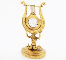 <span class='ref_item'>118 -</span> <span class="description">SOPORTE EN LATÓN DORADO CON RELOJ DE BOLSILLO DE CUERDA MANUAL. ALEMANIA, S.XIX </span>  <p><span class="description">Bronce <br>En forma de lira sostenida por una melusina de dos colas sobre peana. <br>Inscripción en la base "Sr. Hochwürden derri Herri Seminardirector Dr.Barnich, Bitter zur 25 jährichen Amts Fubeltier 22 juni 1837"<br>Con reloj de bolsillo realizado en metal dorado de movimiento de cuerda manual. En estado de marcha<br>582,50 gr.<br>24 cm.</span></p>