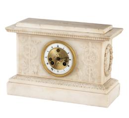 <span class='ref_item'>149 -</span> <span class="description">RELOJ CLERET, DE ALABASTRO, FRANCIA S. XIX </span>  <p><span class="description">Maquinaria París con sonería de campana a horas y medias. Ocho días de cuerda. Realizado en alabastro. Diseño rectangular con motivos vegetales en relieve. Esfera central en porcelana blanca y dorada con números romanos. En estado de marcha. Medidas: 21.5 x 30 x 12.5cm. <br> </span></p>