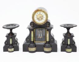<span class='ref_item'>153 -</span> <span class="object_title">GUARNICIÓN DE CHIMENEA COMPUESTO POR RELOJ Y PAREJA DE COPAS, ESTILO NAPOLEÓN III</span>   <p><span class="technique_material">Mármol</span><br><span class="technical_description">Conjunto realizado en mármol negro. Reloj con decoración de columnas en piedra verde y péndulo accionado mediante mercurio.<br/>Sin llave. Necesita revisión. <br/>Pareja de copas decoradas por columna en piedra verde<br/>Medidas reloj: 48cm<br/>Medidas copas: 29 cm</span><br></p>